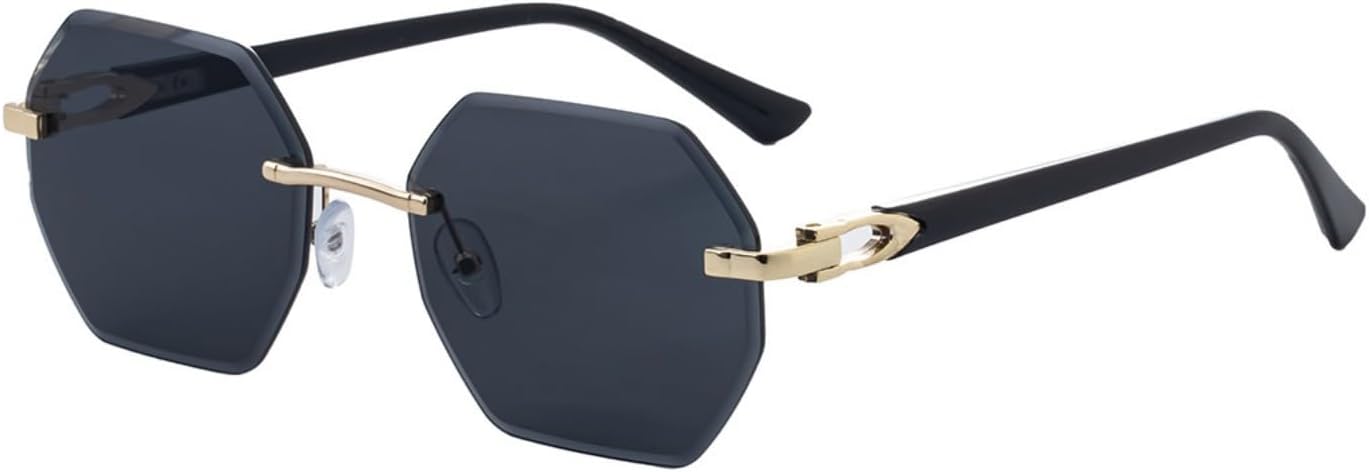 "Eyeglasses style: polygonal Eyeglasses structure: rimless Applicable scene: sunscreen, travel, fashion wear, driving, stage performances, parties and gatherings Lens colour: grey Style classification: fashion commuter Frame material: plastic + metal Frame colour: black UV resistance level: UV400 Frame material: plastic + metal Lens material: PC Popular element classification: lifestyle productsLenses can block UVA and UVB radiation. UV400 rated sunglasses is essential to protecting your eyes against long term UV damage and keeping your eyes healthy when you go out.These trendy rimless sunglasses for women boast polarized lenses designed to reduce glare and reflected light for superior visual clarity and definition.Our women’s polarized sunglasses with UV protection feature a scratch- and impact-resistant lens coating designed to protect against dings and drops.Sunglasses is the perfect choice for outdoor activities such as walking, driving, shopping, travelling, taking photos, and is suitable as high fashion accessory and daily wear all year round. In case any broken problem happens, contact the seller of without hesitation to solve the problem until satisfaction. You have no risk to try and we will provide you the best service!"
